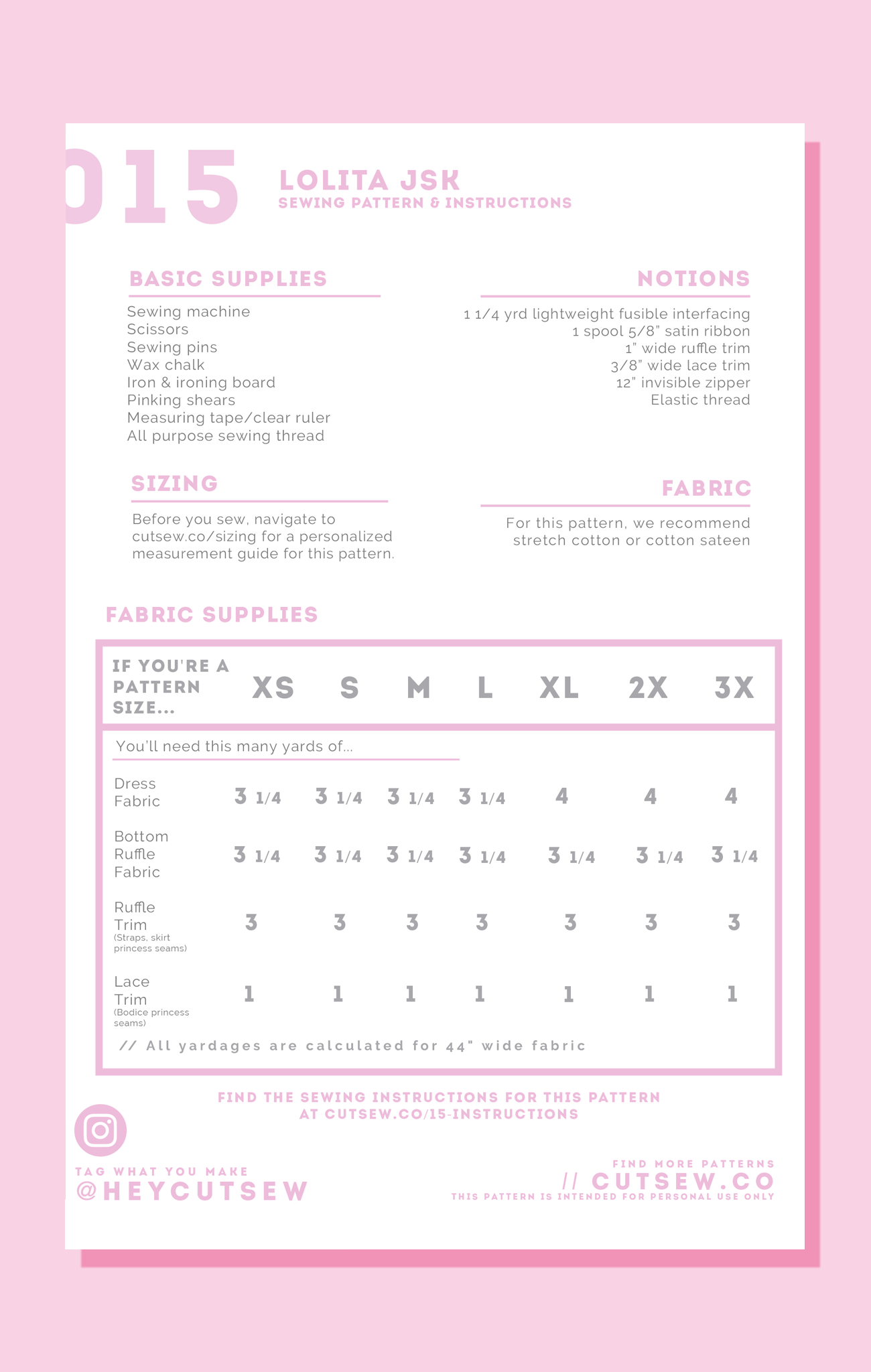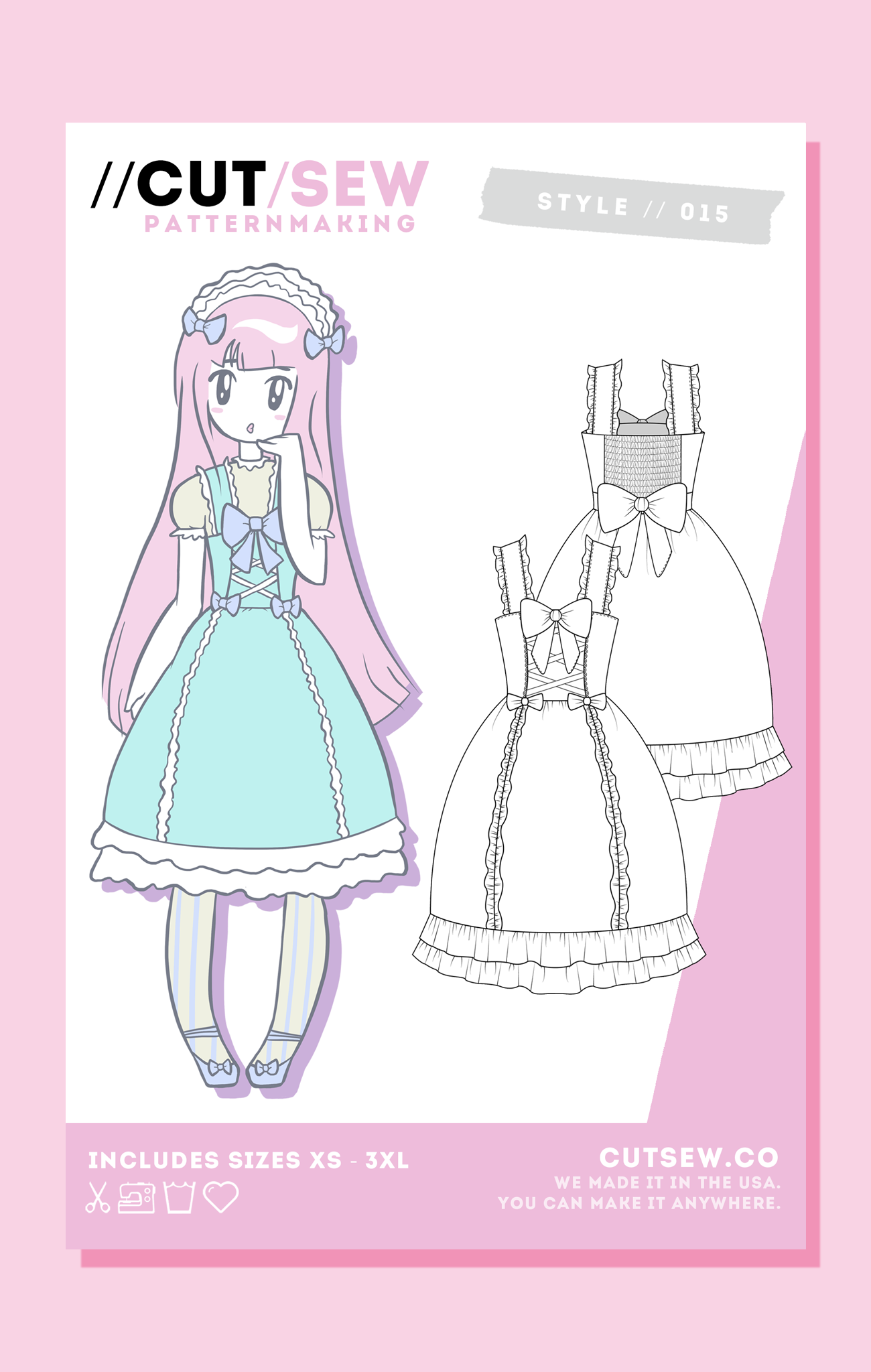 This basic jumper skirt dress is inspired by Lolita street fashion and includes a shirred back, side invisible zipper, and two-tiered skirt ruffles. Easy to customize with the lace, trims, and ribbons of your choosing, this pattern allows you to mix and match the decorative pieces included like bows and ties to fully customize it to your own style. For maximum fullness, we recommend a petticoat with this dress.