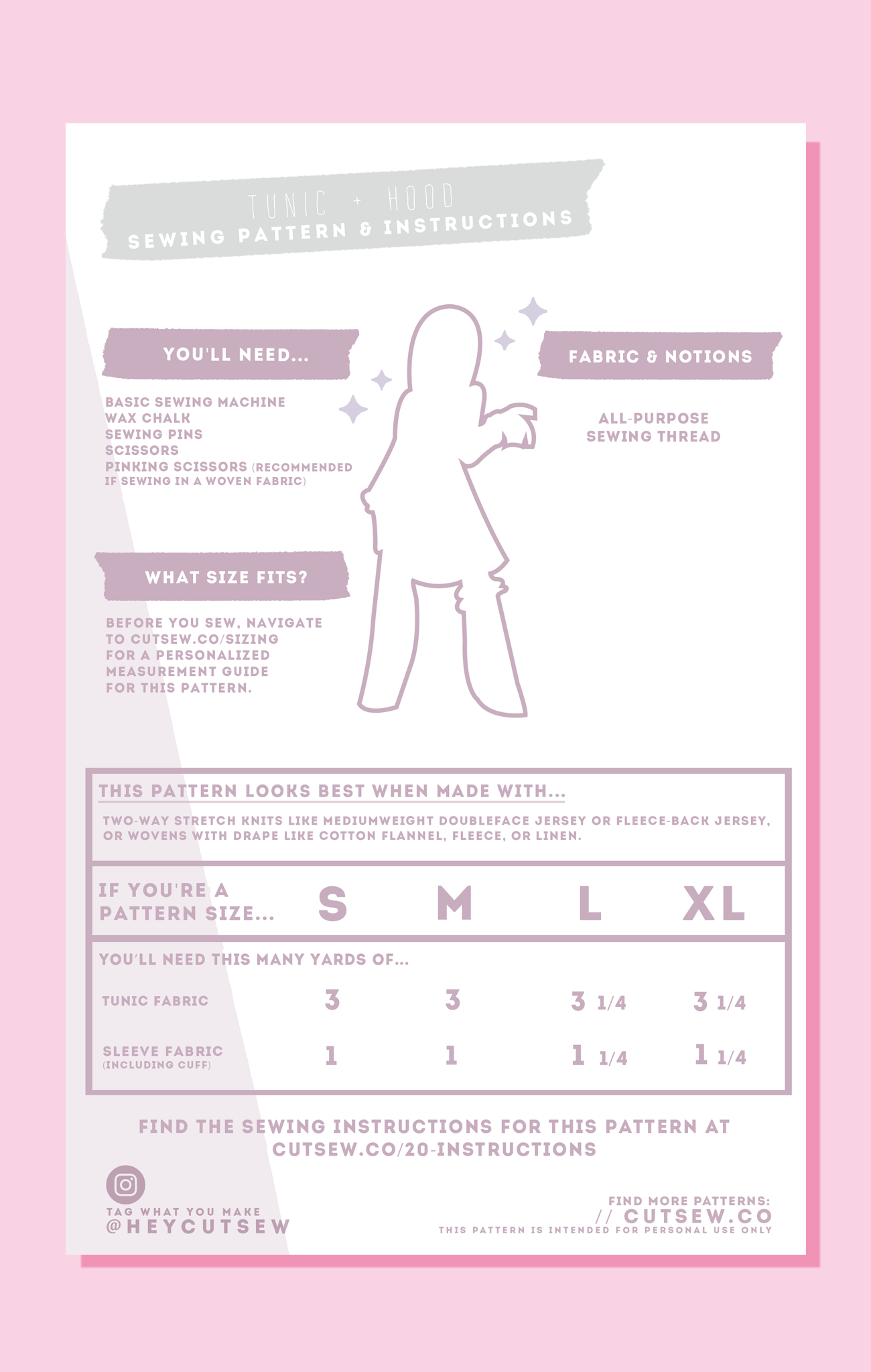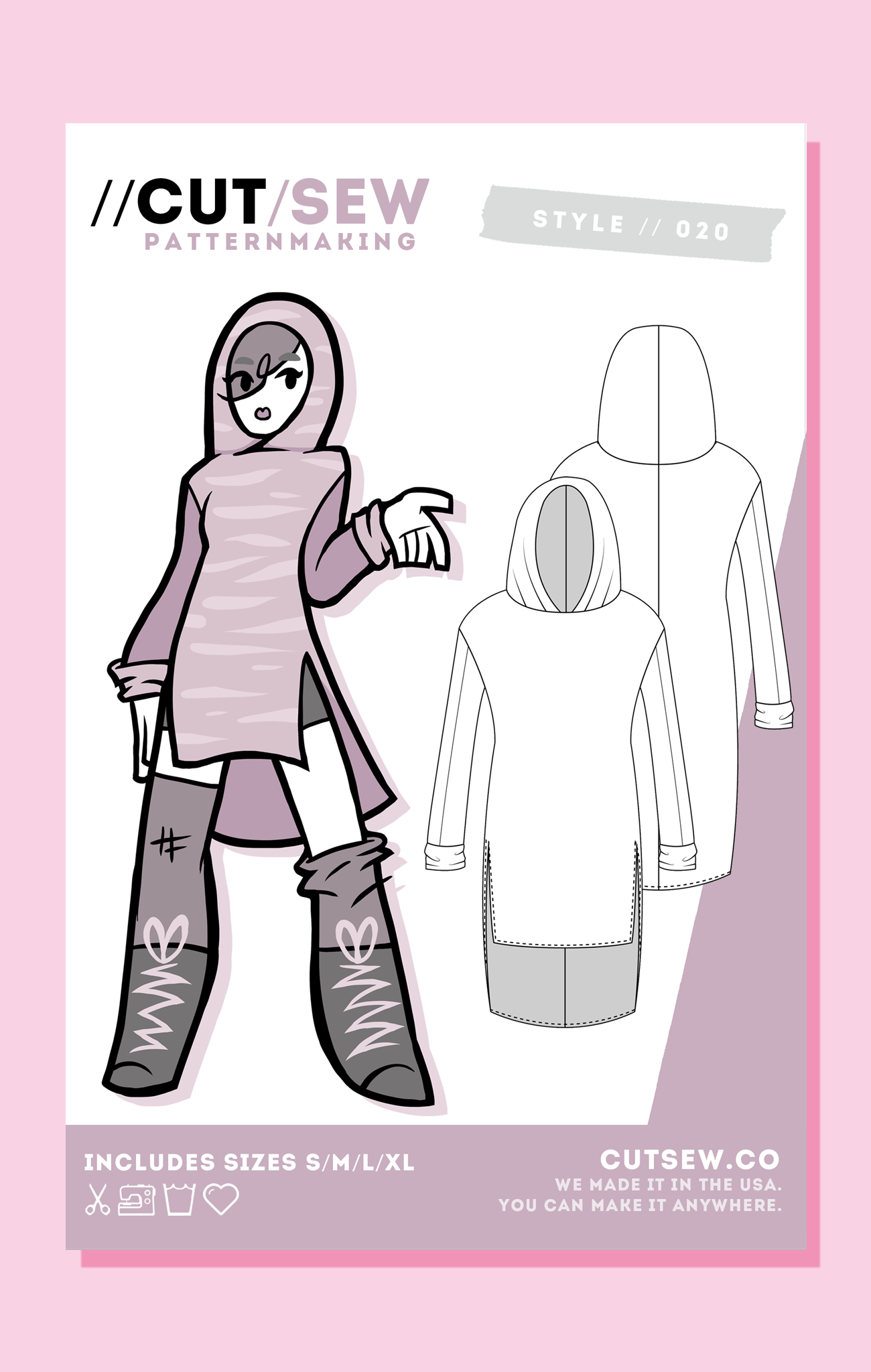 All CUT/SEW patterns are printed on sturdy 30 lb bond paper and packaged in reusable zip-top bags for easy storage. Each pattern includes sizes S-XL and can be modified using the included adjustment instructions to fit up to a US dress size 20.
