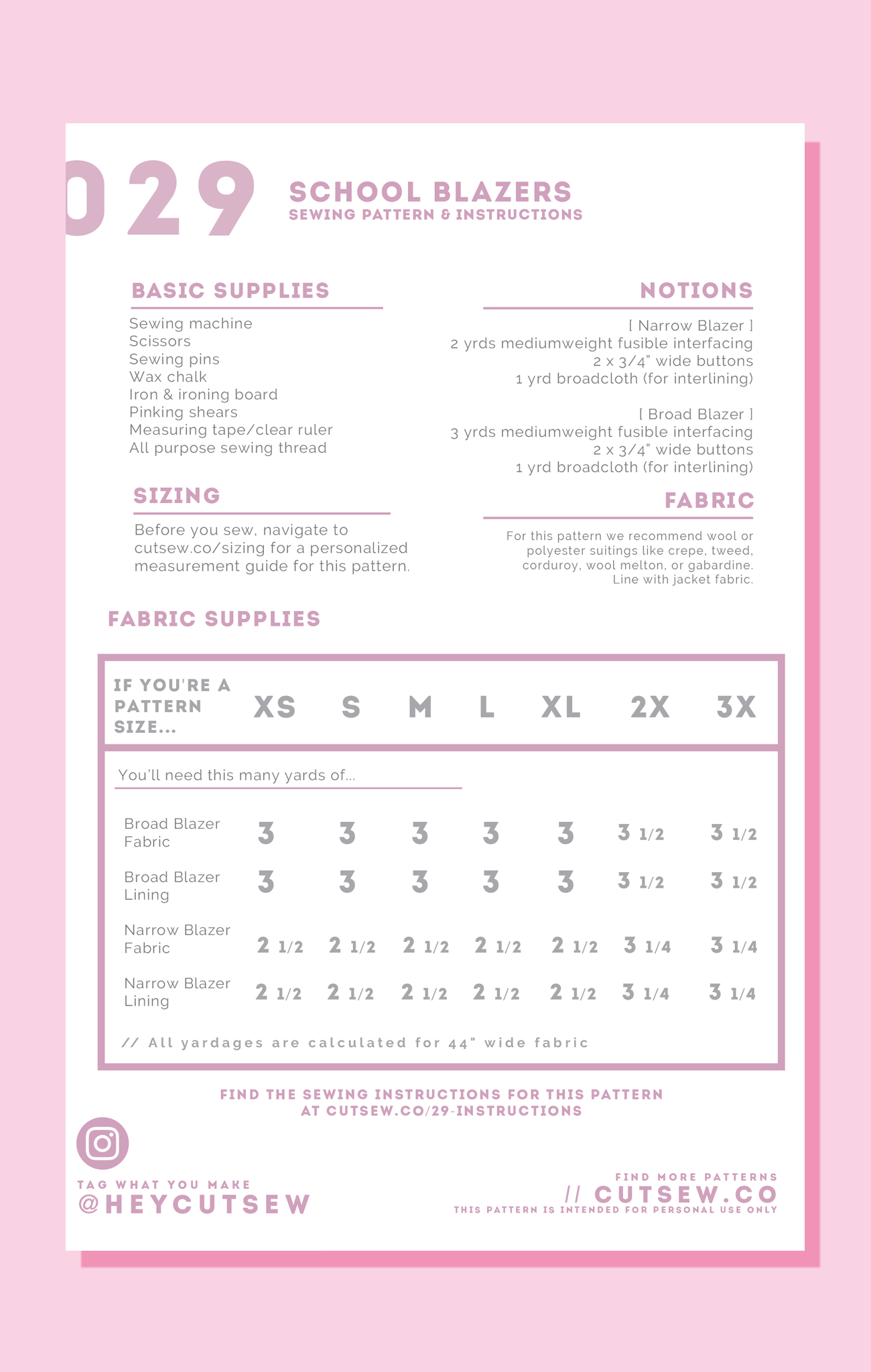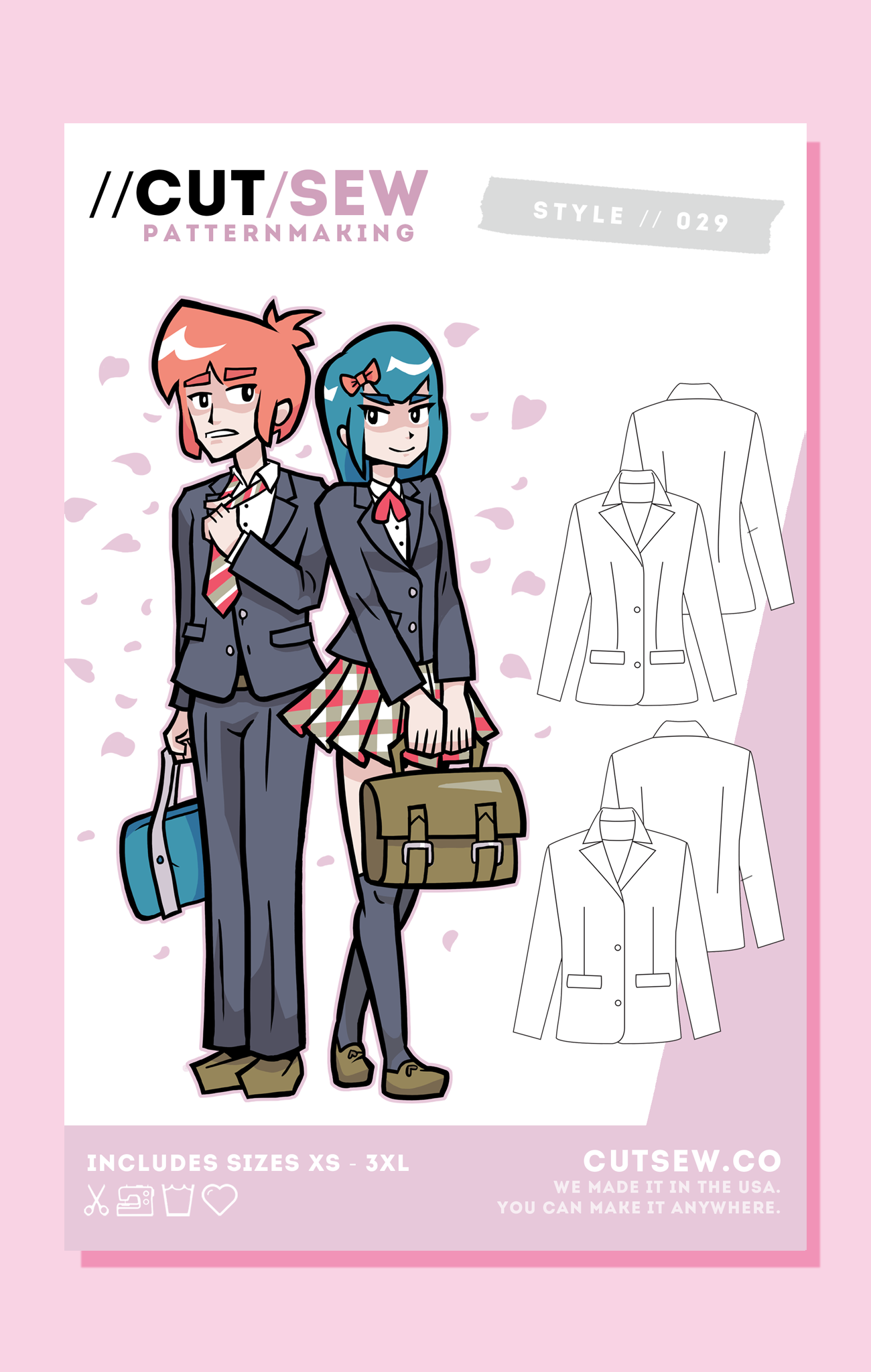Grab that toast, shove it in your mouth, and run to class because this pattern completes our Japanese school uniform cosplay collection. Each blazer features front and back fitted darts, faux-pocket flaps, and a front two-button closure, as well as a fully lined body and sleeves. The narrow blazer is shorter in length and width and features a tailored waist for a more petite fit, while the broad blazer is longer, boxier, and has wider shoulders.