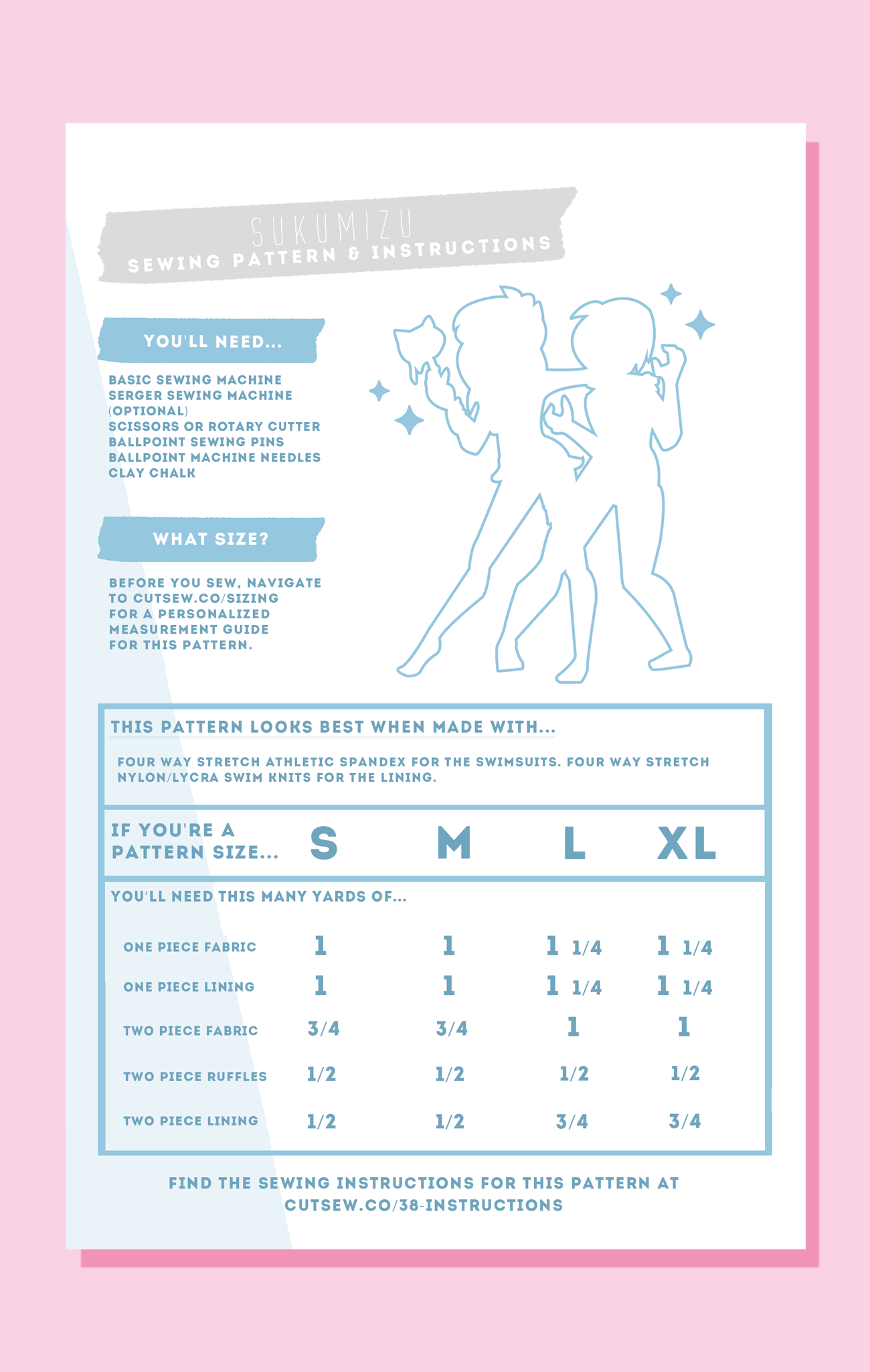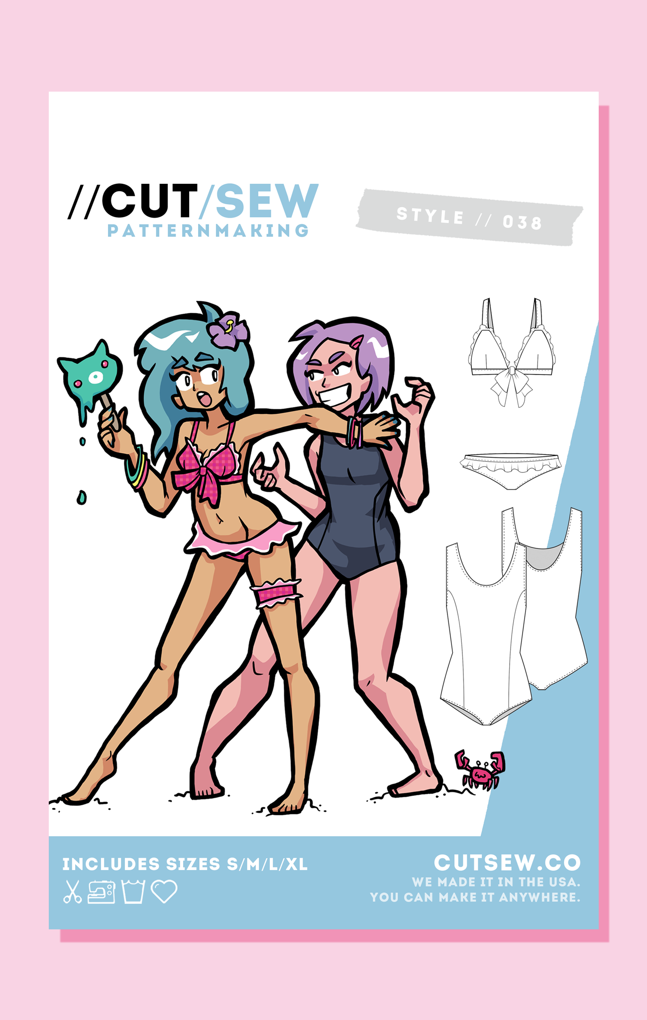 This set includes two patterns perfect for swimsuit cosplay, or just for a customized summer swim wardrobe. Take your pick between a lined sukumizu inspired Japanese school uniform one piece with front harp lines for a slim fit and a low-cut back, or make it extra cute with a frilly two piece with a center front tie and bikini-cut bottoms.
