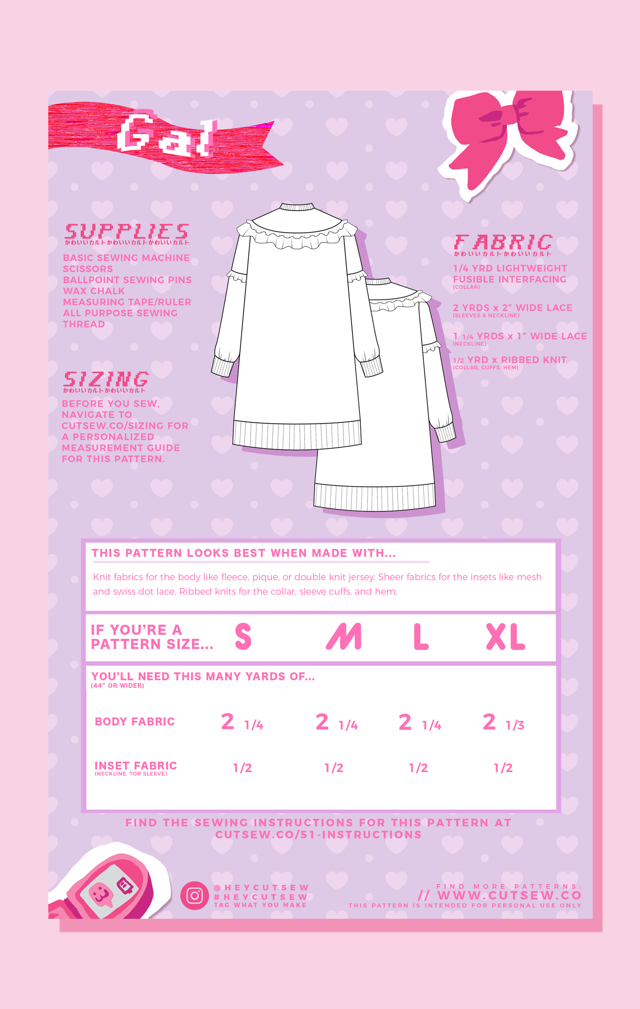 When life gets you down trawl Takeshita Street, buy some ¥400 lip gloss, and have a crepe. This kawaii af shirtdress inspired by contemporary Gyaru fashion features ruffled chest and sleeve inserts, a ribbed knit neckline & hem, and a loose, casual fit. Customize it with sheer lace for the inserts, or layer up for a cute and cozy look that's winter ready.