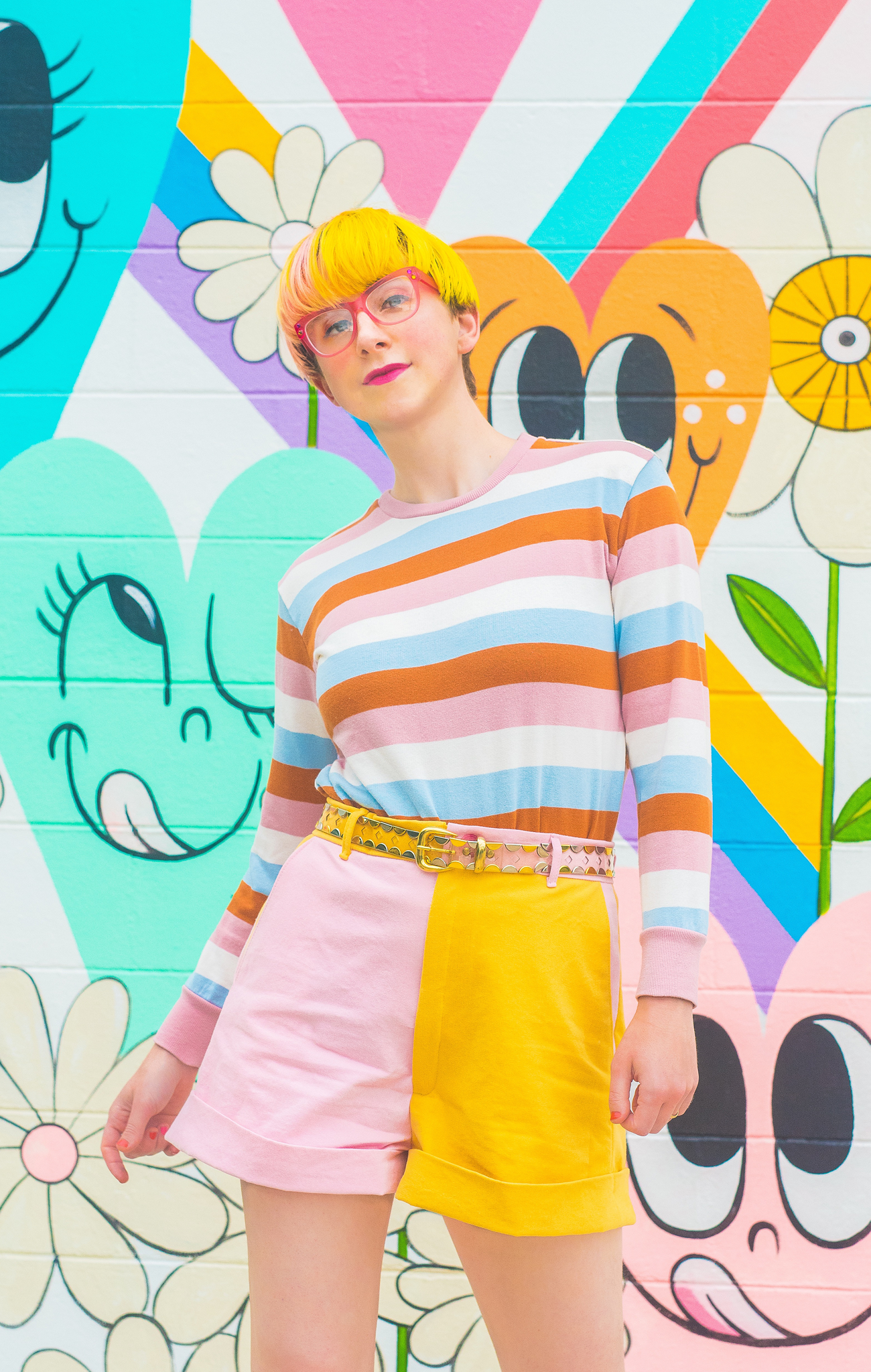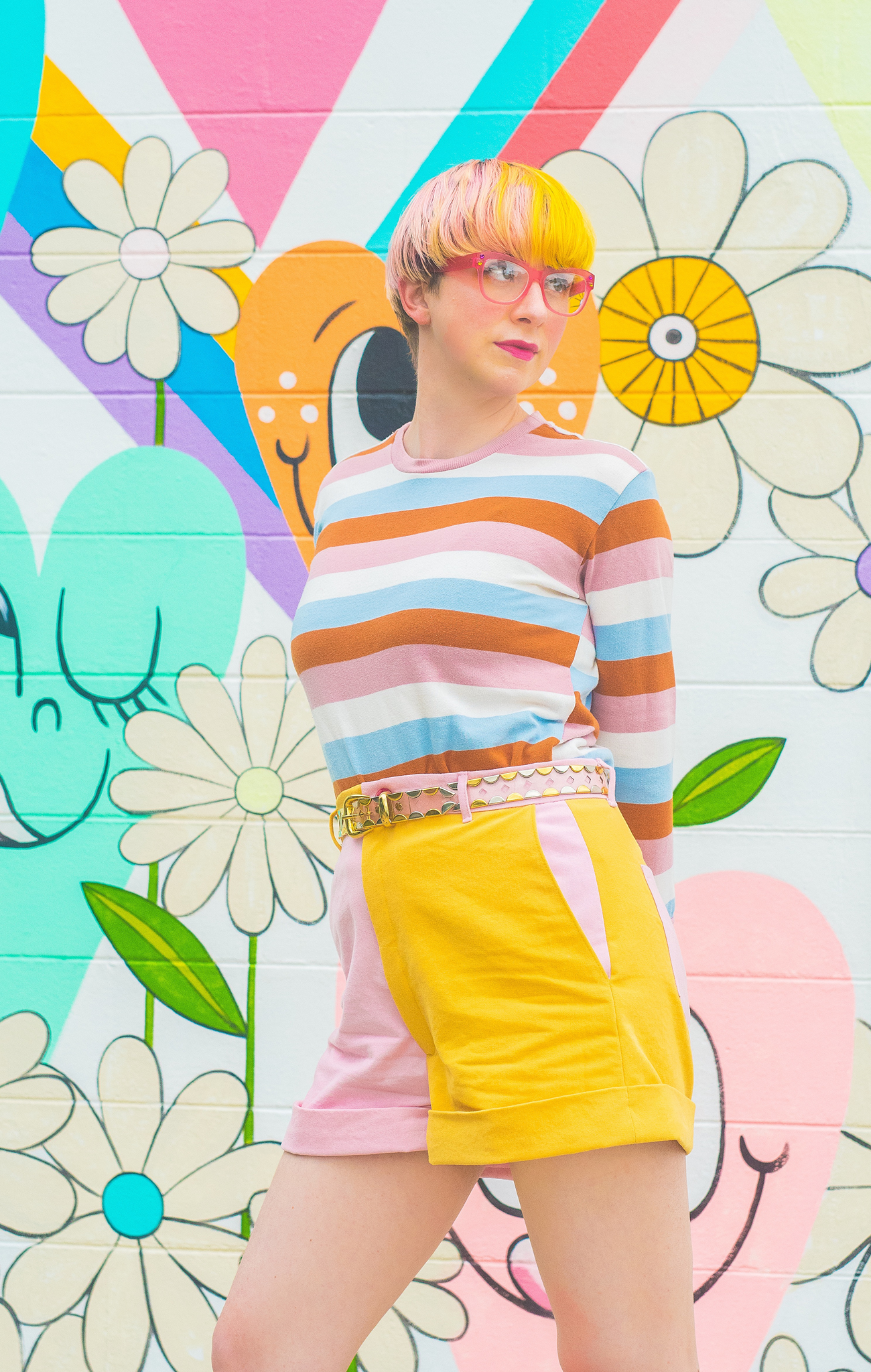 Inspired by street fashion in 90's anime, this pattern includes two fully customizable shorts styles: a split version with princess seam panels so you can mix and match fabrics, or a cuffed version with a simpler silhouette and rolled up cuffs. Both options include full-sized side seam pockets pockets, a zipper and button front fly, back pockets, and a split waistband so you can combine fabrics and colors. Both styles are slightly longer and higher waisted than contemporary shorts, meant for a retro unisex fit.